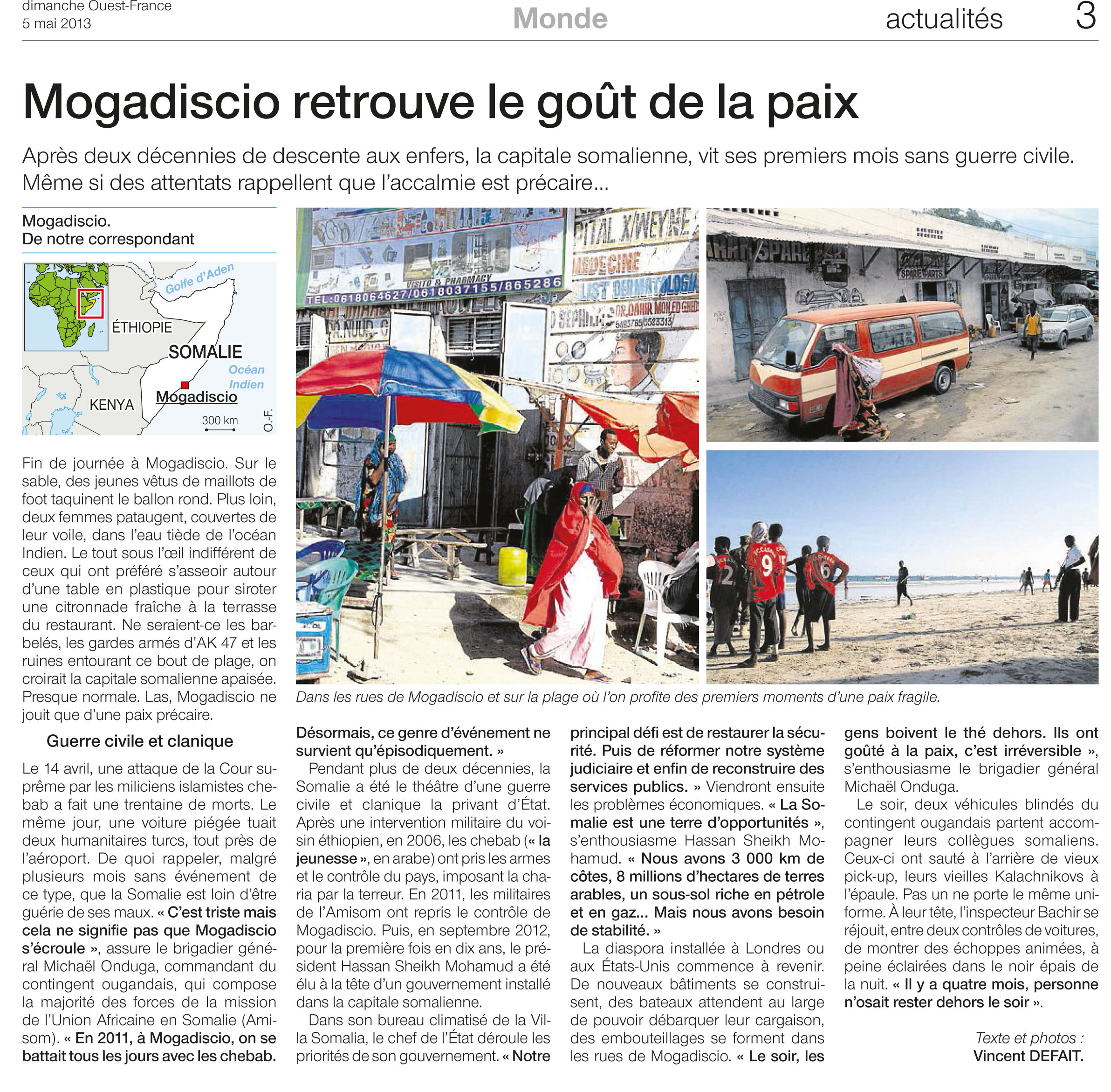 En avril, après des mois d’attente, je m’envole pour Mogadiscio où je retrouve les troupes de l’AMISOM, la mission de l’Union Africaine pour la Somalie. Ses responsables le répètent en boucle : Mogadiscio va mieux. Du moins ne s’y bat-on plus comme avant, l’arme au poing. En fait, la menace a changé de visage. Désormais, les miliciens islamistes Chebabs mènent des raids éclairs dans la capitale. L’avant-veille de mon arrivée, l’attaque de la Cour suprême avait fait une trentaine de morts.