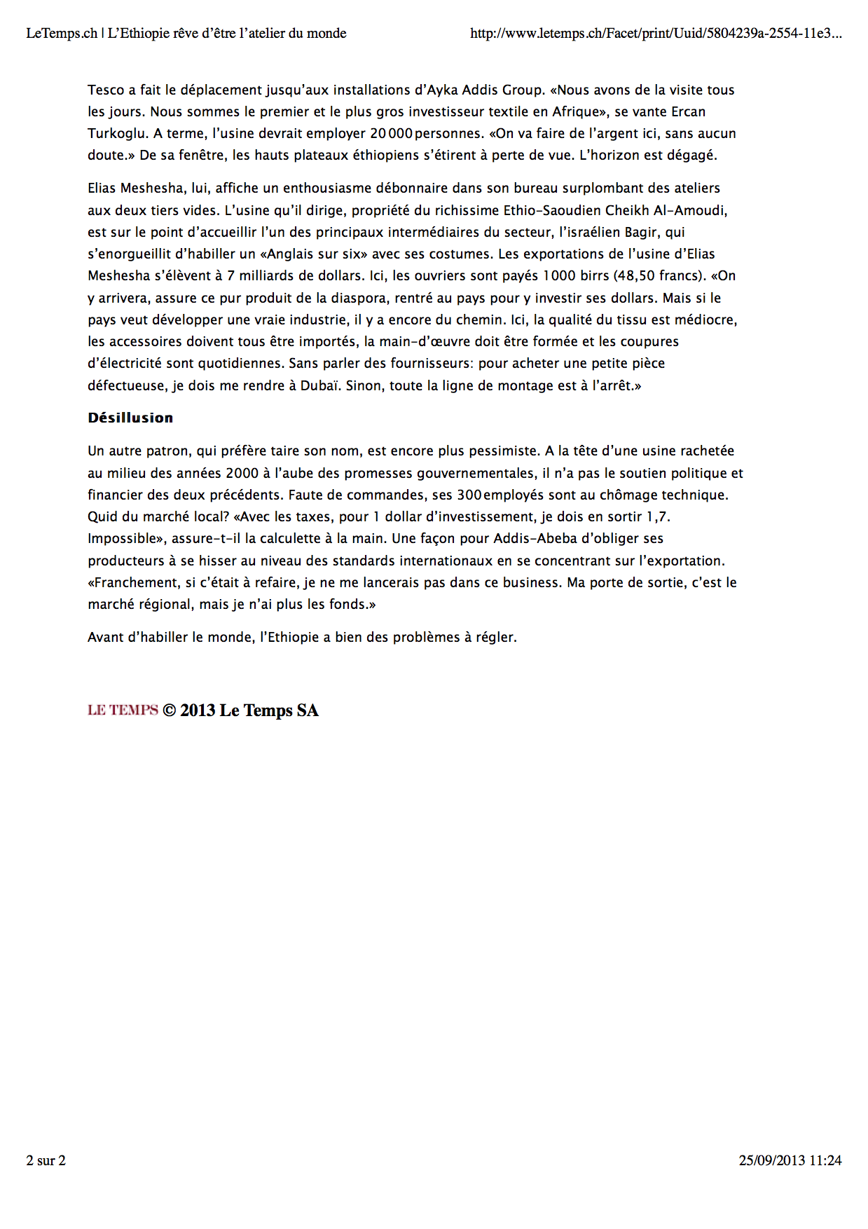 L’Ethiopie, donc, aimerait supplanter l’Asie et son industrie pour, un jour, vêtir le monde. Quelques grands noms et gros capitaux (H&M, Tesco…) ont déjà été séduit par les appels du pied du gouvernement d’Addis-Abeba, par la main d’oeuvre si bon marché (pensez, les salaires ici représentent