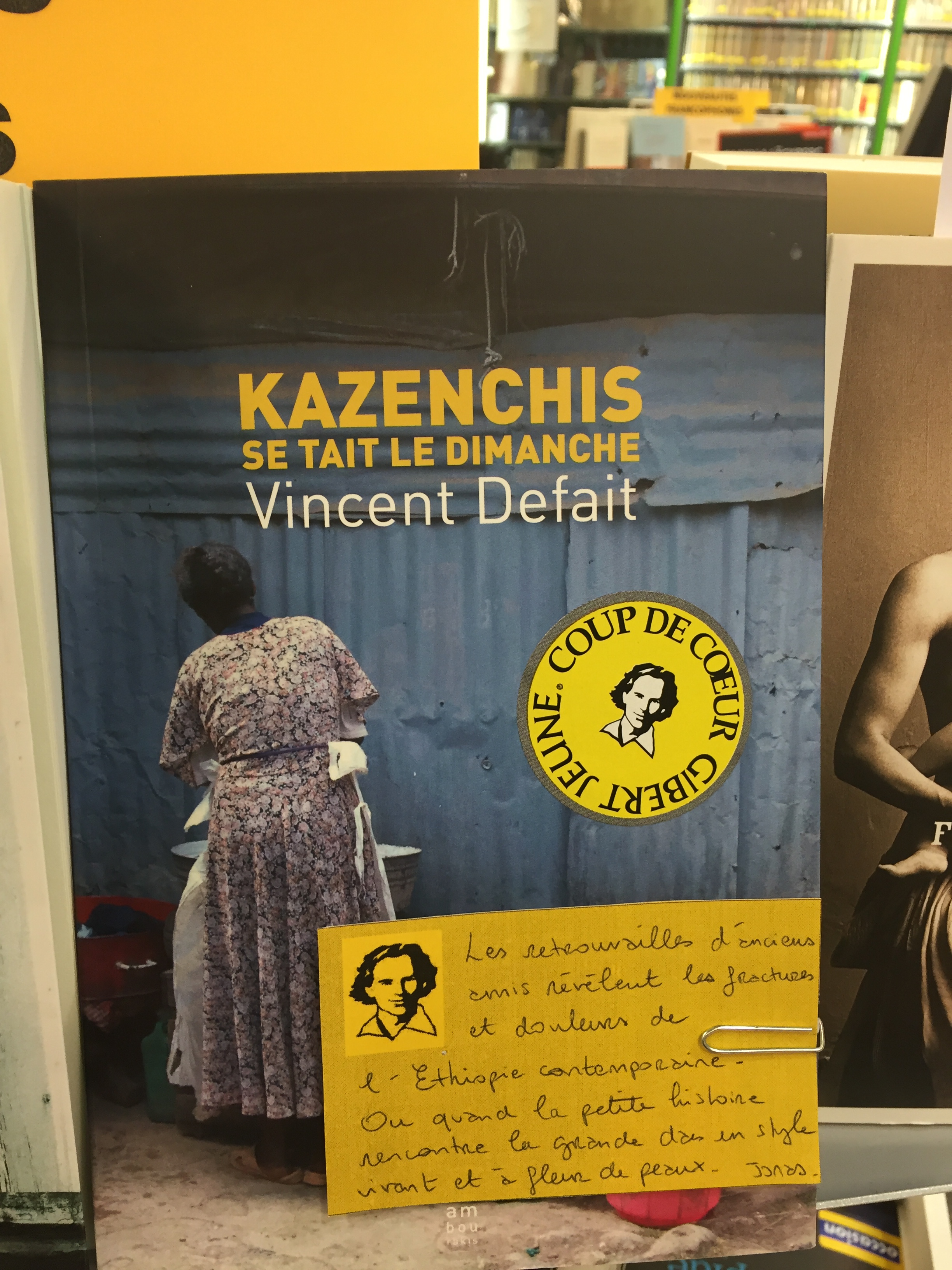 Petite satisfaction personnelle : parmi d’autres retours positifs, celui-ci de l’une des librairies parisiennes Gibert Jeune, qui a eu un « coup de coeur » pour « Kazenchis » et présente le livre avec un joli mot d’accompagnement que je reproduis ici :